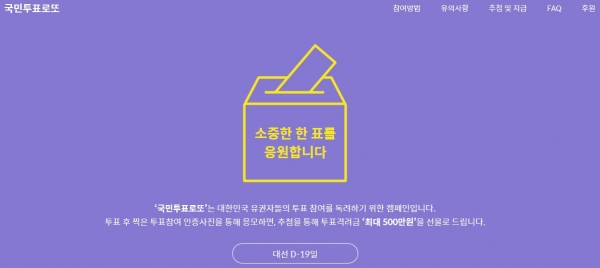 17일 ‘국민투표 로또’라는 사이트가 개설됐다. 해당 사이트를 만든 이는 스타트업 개발자 윤병준(31) 씨와 그의 친구들. 이들은 평소 선거 때면 발생하는 낮은 투표율을 높이기 위한 방법을 고민하던 중 TV 프로그램에서 언급된 투표 복권에서 아이디어를 얻어 이 홈페이지를 열게 됐다고 말했다.
