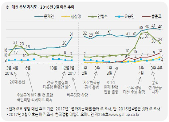 한국갤럽이 2017년 4월 넷째 주(25~27일) 전국 성인 1,006명에게 누가 다음번 대통령이 되는 것이 가장 좋다고 생각하는지 물은 결과, 문재인 40%, 안철수 24%, 홍준표 12%, 심상정 7%, 유승민 4%, 조원진 1%, 없음/의견유보 11%로 나타났다.