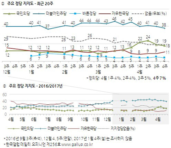 한국갤럽이 2017년 4월 넷째 주(25~27일) 전국 성인 1,006명에게 현재 지지하는 정당을 물은 결과, 더불어민주당 38%, 국민의당 18%, 자유한국당 11%, 정의당 7%, 바른정당 4%, 새누리당 2%, 없음/의견유보 19%로 나타났다.