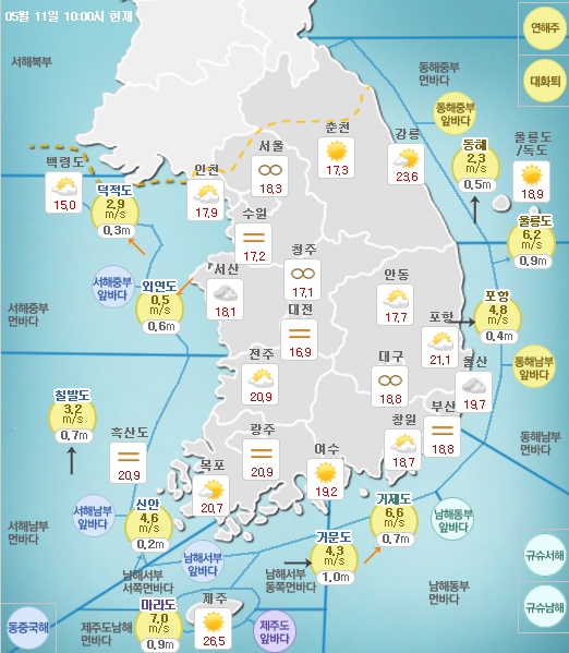 11일 오전 10시 현재, 전국에 구름이 많고 충청도와 경북에는 천둥.번개를 동반한 비가 오는 곳이 있으며, 그 밖의 지방에는 빗방울이 떨어지는 곳이 있다.