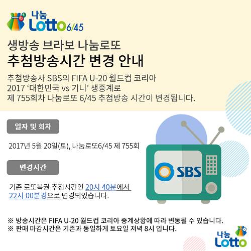 복권통합수탁사업자 ㈜나눔로또(대표 박중헌)는 2017 FIFA U-20 월드컵 코리아 ‘대한민국 vs 기니‘ 축구 생중계로 인해 나눔로또 제 755회차 로또복권 추첨생방송이 기존보다 80분 가량 늦게 방송될 예정이라고 밝혔다.