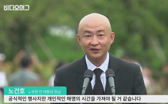 노건호 씨는 추도사 낭독 전 "공식적인 행사지만 개인적인 해명의 시간을 가져야 될 거 같다"며 헤어스타일에 변화가 좀 있었다"고 말했다.