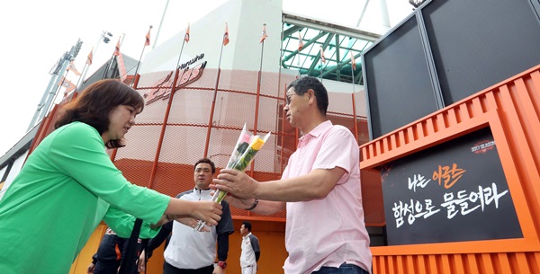 팬들은 김 전 감독에게 미리 준비한 장미꽃 세 송이를 전달했다. 주차장에서 차를 기다리던 김 감독은 팬들에게 미소를 보이면서 손을 흔들었다.