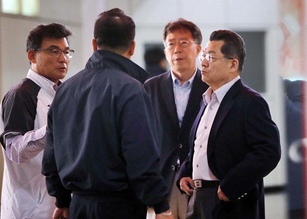 짧은 작별 인사가 끝난 뒤 김신연 사장과 박종훈 단장 등 구단 수뇌부도 클럽하우스로 들어갔다. 김 전 감독과 '껄끄러운 사이'였던 박 단장 역시 마지막 인사를 했다.