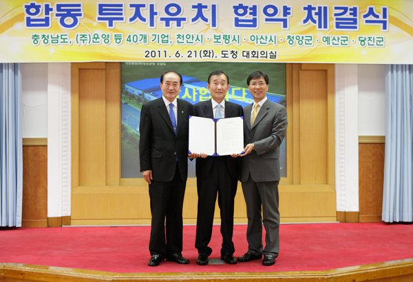 21일 충남도청 대회의실에서 안희정 도지사, 이시우 보령시장, 김영진 오쿠회장 등이 참석한 가운데 보령시 청소면 야현리와 장곡리 일원 청소농공단지 입주에 따른 투자협약을 체결했다.