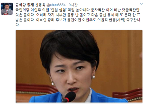 신 총재는 전날에도 자신의 SNS 계정을 통해 "이언주 의원 '막말 논란' 국민의당 남자 정청래 꼴이고 제2의 정미홍 꼴이다"라고 비유했다.