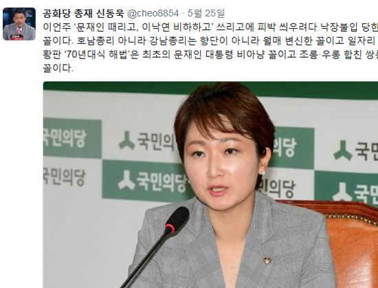 신 총재는 25일에도 자신의 트위터에 "이언주 '문재인 때리고, 이낙연 비하하고' 쓰리고에 피박 씌우려다 낙장불입 당한 꼴이다"라는 글을 올렸다.