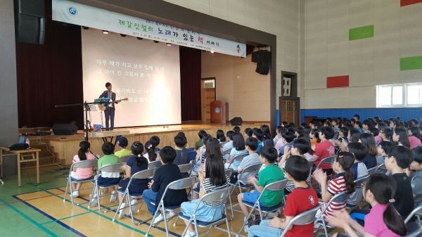 세종시교육청은 29일 도담초등학교 강당에서 관내 학생들의 삶에 대한 성찰과 인문학적 소양을 키우기 위해 ‘2017 학교로 찾아가는 인문학 콘서트’를 개최했다. 콘서트에선 ‘노래가 있는 책 이야기’란 주제로 샌드아트 공연과 북뮤지션 제갈인철 작가의 노래가 있는 문학 이야기 강연이 펼쳐졌다.