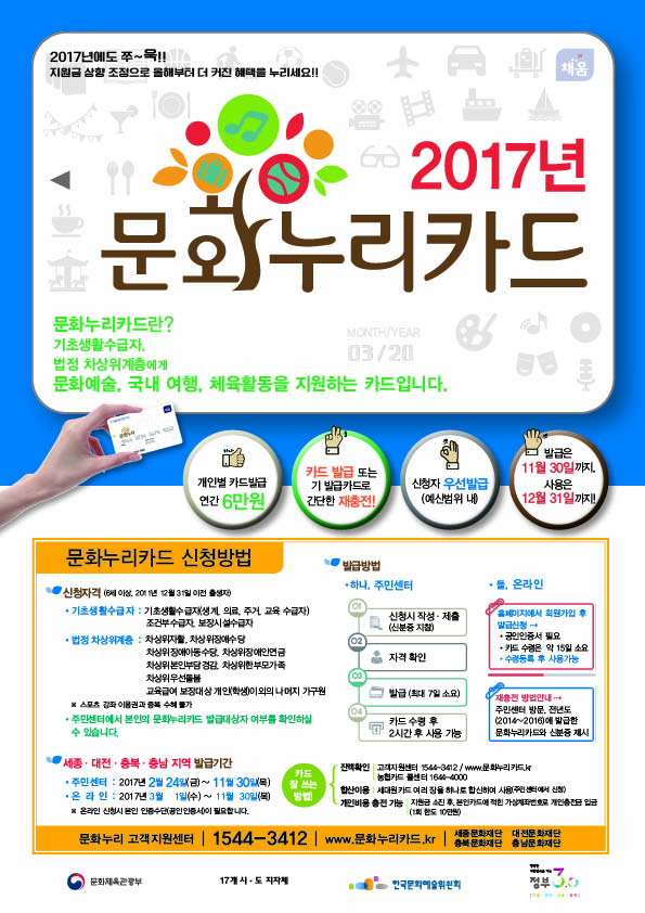 문화누리카드 신분증 지참 후 가까운 주민센터를 방문하거나 문화누리카드 홈페이지(www.문화누리카드.kr)에서 신청할 수 있으며 지난해 발급받은 소지자는 재충전 후 사용할 수 있다. 문화누리카드의 주요 가맹점은 공연, 온천, 영화, 도서, 음반, 고속버스, 철도 등이며 올해는 체육용품점, 악기소매점, 한복점까지 확대됐다.
