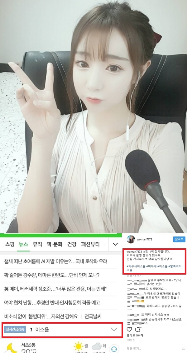 이소율은 5일 자신의 인스타그램을 통해 "실검 1위 감사합니다. 미우새 촬영 재미있게 했고요. 관심 가져주셔서 너무 감사합니다."라는 글과 함께 한 포털사이트 화면을 캡처해 게재했다.
