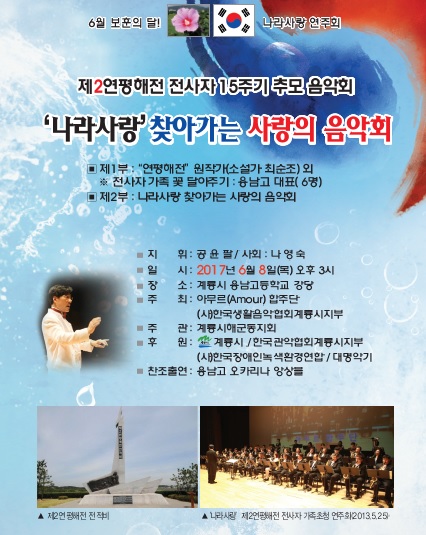 6월 호국보훈의 달과 15년 전 제2연평해전으로 희생된 국군 장병들의 숭고한 넋을 기리기 위한 ‘나라사랑’ 찾아가는 사랑의 음악회가 8일 오후 3시 충남 계룡 용남고등학교 강당에서 열린다.