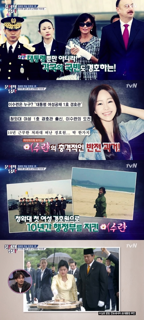 이수련은 최근 방송된 tvN '뇌섹시대-문제적 남자'에 출연해 2004년부터 2013년까지 청와대 첫 여성 경호원으로 근무한 이력을 공개했다.