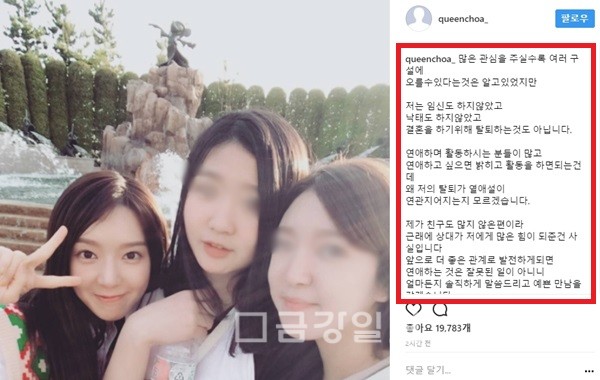 초아는 23일 자신의 인스타그램에 “많은 관심을 주실수록 여러 구설에 오를 수 있다는 것은 알고 있었지만 저는 임신도 하지 않았고 낙태도 하지 않았고 결혼을 하기위해 탈퇴하는것도 아닙니다.”라고 토로했다.
