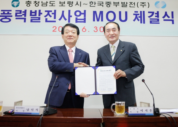 시와 한국중부발전㈜(사장 남인석)은 30일 오전, 보령시 옥마산 일대에 설비용량 20MW의 풍력발전소를 건설하는 것을 내용으로 하는‘신재생에너지 분야 상호협력 양해각서’를 체결했다.