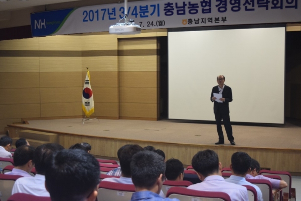 유찬형 농협중앙회 충남지역본부장이 24일 농협세종교육원에서 충남지역 하반기 사업추진과 건전결산을 위한 3분기 경영전략회의를 주재하고 있다.