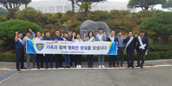 금산경찰서(서장 유희정)는 26일 경찰서 정문에서 청렴동아리 회원이 참석한 가운데 공직기강 확립과 청렴·인권·피해자보호를 위한 ‘추석 명절 선물 안 주고 안 받기’캠페인을 전개했다.