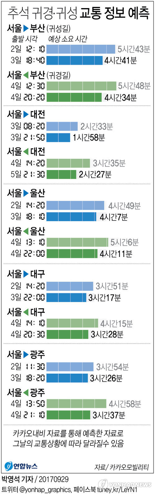 29일 카카오의 교통 부문 자회사 카카오모빌리티가 2011년 이후 명절 연휴 교통 상황 빅데이터를 분석한 결과에 따르면 이번 추석 서울∼부산 귀성길은 10월 3일 오후 6시40분에 출발하면 4시간 41분이 걸려 가장 원활할 것으로 예상됐다.