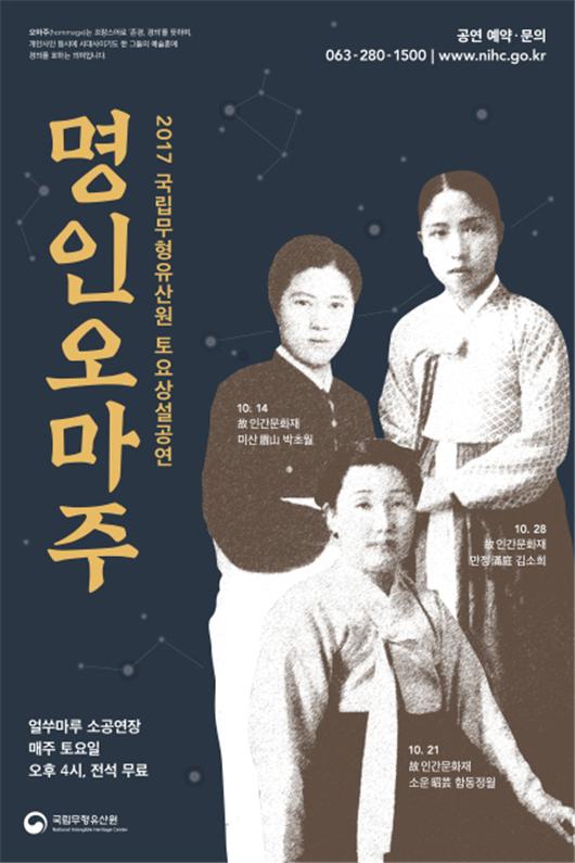 국립무형유산원은 작고한 무형문화재 보유자의 삶을 조명해보는 공연 2017 명인 오마주를 오는 14일부터 28일까지 매주 토요일 오후 4시 무형유산원 얼쑤마루 공연장에서 개최한다.