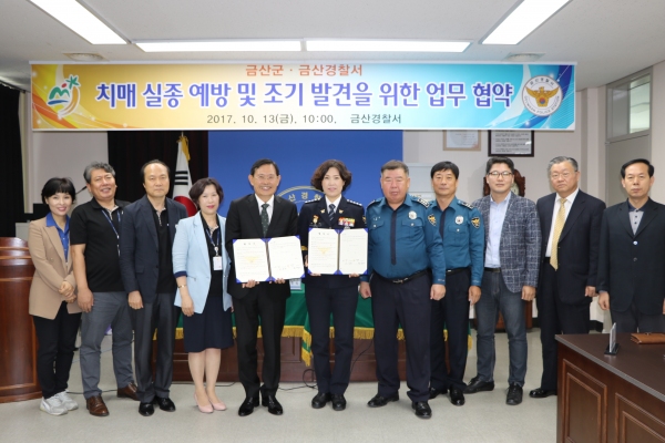 금산경찰서(서장 유희정)는 지난 13일 정부의 ‘치매국가책임제’의 본격 시행에 앞서 금산군과 함께 ‘치매노인 실종 ZERO사업’을 위한 업무협약을 체결하고 본격 실행에 착수했다.