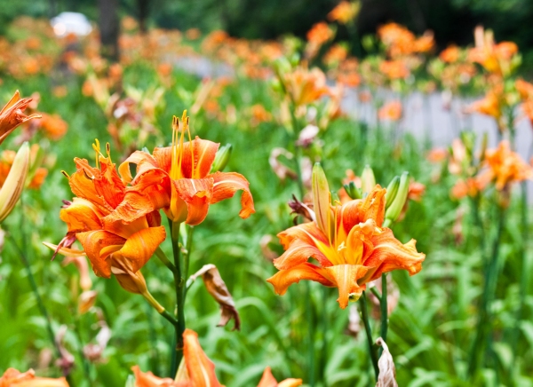 성주산 구 보령 성주산 구 도로 산책길 2km 구간의 중간 중간 느티나무 사이에 심어진 원추리가 만개해 등산객들에게 향기로운 꽃내음을 뿜어내고 있다.
