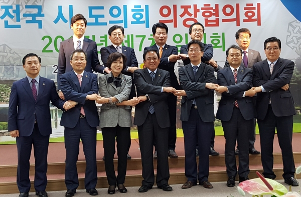 대전시의회 김경훈(뒷줄 왼쪽에서 두 번째), 세종시의회 고준일(〃 〃 첫 번째), 충남도의회 윤석우(앞줄 맨 오른쪽), 충북도의회 김양희(〃 왼쪽에서 세 번째) 의장은 지난 20일 충주 한화리조트에서 열린 ‘전국시·도의회의장협의회 2017년 제7차 임시회’에 참석, 내년도 세입·세출 예산안 등을 심의·의결했다. 대전시의회 제공
