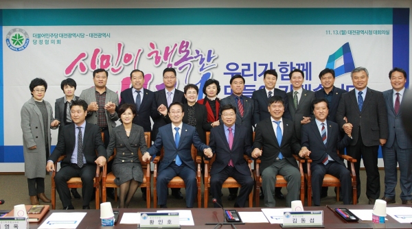 대전시는 13일 대전시청에서 새 정부 출범 이후 지역 현안사업 해결을 위해 ‘더불어민주당 대전시당과 대전시 간 당정협의회’를 개최했다. 권선택 시장은 이 자리에서 다양한 시민의견을 수렴해 추진 중인 도시공원 조성사업, 갑천 친수구역 조성사업, 유성 광역복합환승센터 개발사업에 관심을 요청하고 옛 충남도청사 부지매입비 국비확보와 스마트시트 시범사업 및 도시재생 뉴딜사업의 중앙공모 등 주요 현안에 대한 초당적 지원을 당부했다. 대전시 제공