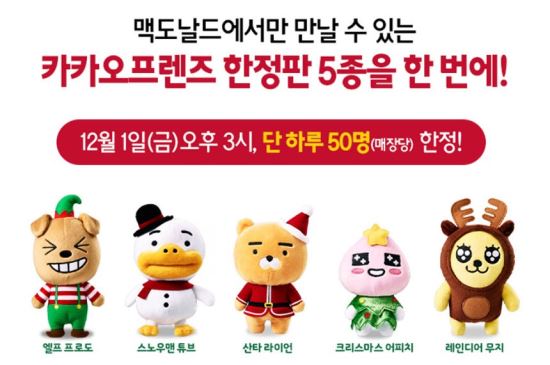 카카오프렌즈는 카카오가 출시한 이모티콘 캐릭터로, 이번 맥도날드 한정 판매 이벤트에서 는 라이언·프로도·튜브·어피치·무지 등 다섯 캐릭터의 크리스마스 인형이 출시됐다.