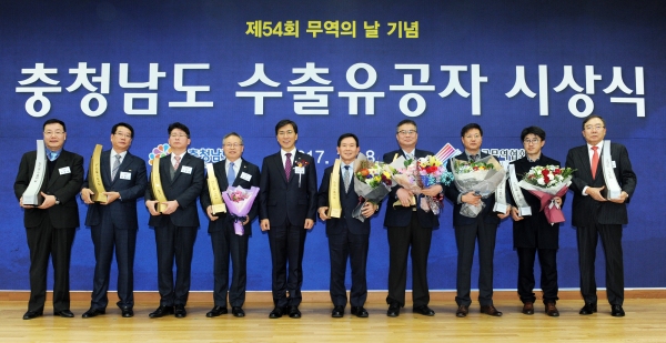 충남도와 한국무역협회 대전세종충남지부는 8일 도청 대회의실에서 안희정 지사와 안경남 대전세종충남기업협의회장, 기업인 등 100여 명이 참석한 가운데 ‘제54회 무역의날 기념 유공자 시상식’을 했다.