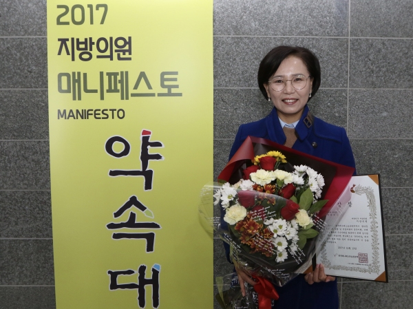 김 의원은 지난 12일 한국매니페스토실천본부 주관으로 서울 영등포아트홀에서 열린 ‘2017 지방의원 매니페스토 약속대상’ 시상식에서 광역의원 공약이행분야 약속대상을 받았다.