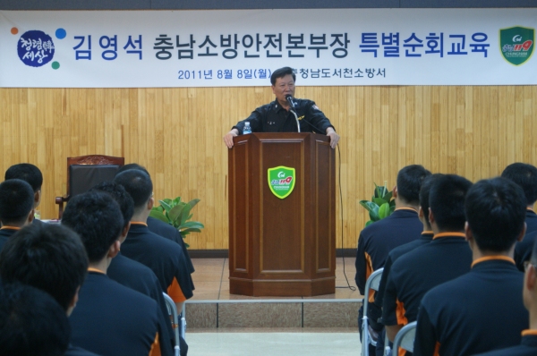 류봉희 서천소방서장으로부터 2011년 상반기 주요 추진업무 및 당면현안사항에 대한 보고를 받고 전 직원을 대상으로 ‘청렴한 공직사회, 그리고 우리가 나가야할 방향’이란 주제로 특강을 했다.