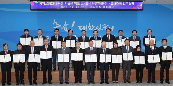 충남도는 27일 도청 대회의실에서 한국서부발전㈜, 공주대 등 도내 25개 대학과 ‘지역균형인재 육성지원을 위한 업무협약’을 맺었다. 이번 협약은 도내로 이전한 공공기관에 지역 대학생들이 취업할 수 있는 기회를 확대하고자 마련됐다.