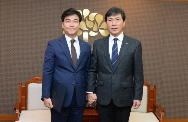 안희정 충남지사(오른쪽)가 15일 도청 접견실에서 윤원철 신임 정무부지사에게 임용장을 수여한 뒤 기념촬영하고 있다. 정계 진출을 선언한 허승욱 전 정무부지사 후임으로 도에 입성한 윤 부지사는 민선 5·6기 마무리와 민선 7기 인수인계를 차질없이 추진할 적임자라고 도는 설명했다. 충남도 제공
