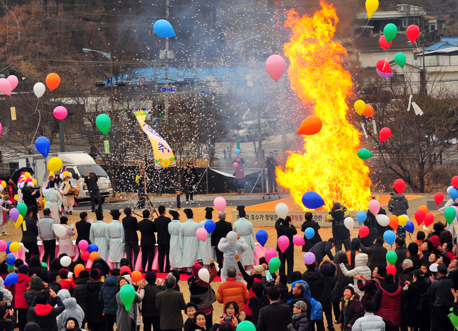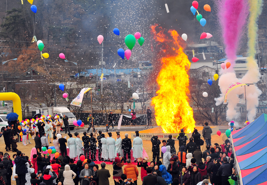 제17회 대청호반 정월대보름행사가 28일 대전 동구 대청동 다목적회관 광장에서 열려 관계자들이 달집태우기 등 세시풍속을 재연하며 한 해의 소망을 기원하고 있다. 전우용 기자 yongdsc@ggilbo.com