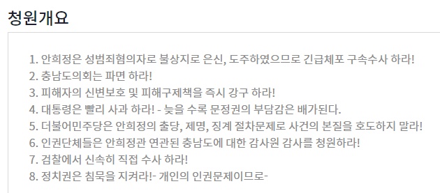 한편, 청와대 국민청원 게시판에는 “권력을 이용해 개인의 인권을 박탈하는 성폭력은 정치계부터 근절돼야 한다” 등의 글과 함께 안 전 지사를 긴급 체포해 처벌해 달라는 청원이 빗발치고 있다.