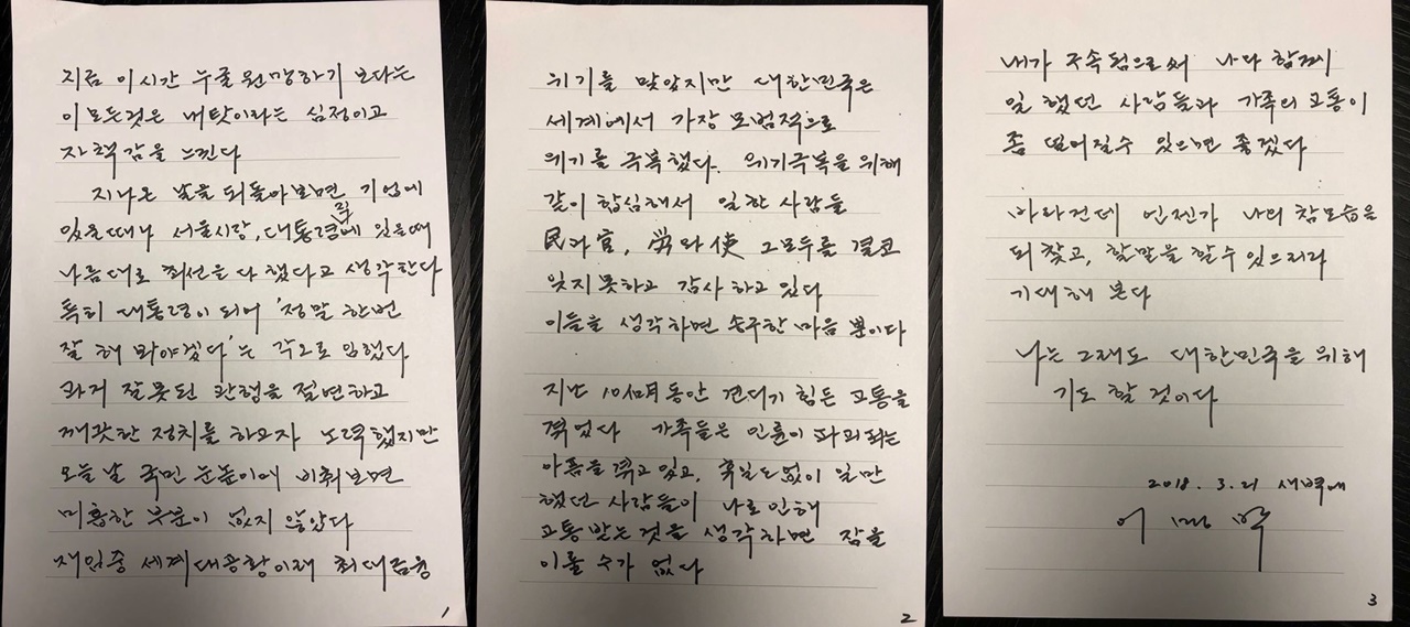 또 “지난 10개월 동안 견디기 힘든 고통을 겪었다. 가족들은 인륜이 파괴되는 아픔을 겪고 있고 휴일도 없이 일만 했던 사람들이 나로 인해 고통 받는 것을 생각하면 잠을 이룰 수가 없다”며 “내가 구속됨으로써 나와 함께 일했던 사람들과 가족의 고통이 좀 덜어질 수 있으면 좋겠다. 바라건대 언젠가 나의 참모습을 되찾고 할 말을 할 수 있으리라 기대해본다. 나는 그래도 대한민국을 위해 기도할 것이다. 2018.3.21 새벽 이명박”이라고 써있다. 글은 23일 0시 현재 5만 4000개의 댓글과 1만 4000회 공유가 되는 등 빠르게 온라인으로 확산되고 있다.