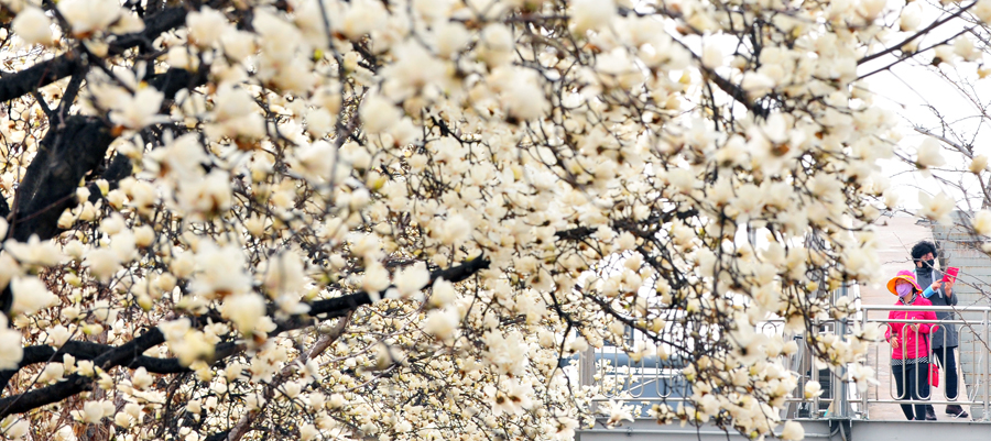 따스한 봄날씨가 이어진 가운데 29일 대전 서구 둔산동 한 인도변에서 미세먼지와 황사로 인해 마스크를 쓴 시민들이 만개한 하얀 목련을 사진찍으며 추억을 남기고 있다.