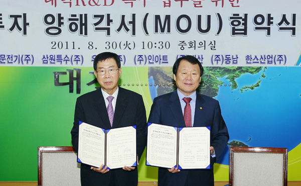 대전시는 30일 시청 중회의실에서 염홍철 대전시장을 비롯해 박은용 협의회 회장 및 7개 기업 대표들이 참석한 가운데 대덕연구개발 특구 입주를 위한 투자 ‘양해각서’를 체결했다.