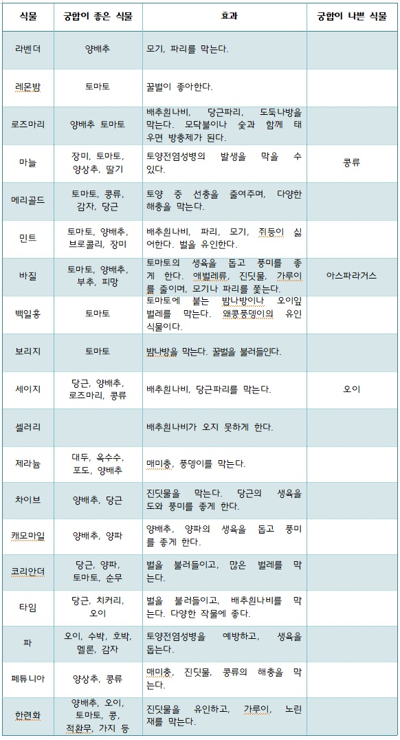 동반식물은 국내·외에서 작물재배 시 활용되고 있으며, 텃밭을 가꿀 때도 동반식물끼리 조합하면 관리가 훨씬 수월해진다.