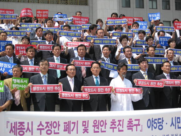 “정권이 국민과 맞서려고 하고 있다”행정도시 문제를 둘러싼 성난 민심이 국회 앞에서 표출됐다. 분권ㆍ회의원들은 21일 국회 앞에서 기자회견을 열고 ‘세종시 수정안에 대한 폐기’를 촉구했다.이들은 이날 기자회견문을 통해“6ㆍ2 지방선거는 정권과 한나라당이 주장해 왔던‘행정도시 국민투표’였다. 선거 결과는 민심에 역행한 이명박 정권과 세종시 수정 추진에 대한 국민의 심판이었다”며 “정권은 국민적 심판을 겸허히 수용해 세종시 수정안을 스스로 포기하고 원안 추진 의지를 국민 앞에 공개적으로 천명해야 한다”고 주장했다.이들은 이어 “정권과 정치권 일각에서 만약 세종시 수정안이 국회에서 부결될 경우 충청권은 쪽박을 차게 될 것이라는 협박이 나오고 있다”며 “6ㆍ2 지방선거를 통해 국민이 원하는 것이 과연 무엇인지 명확해 졌는데 세종시 갈등을 더 끌고 간다면 정권과 여당은 회복할 수 없는 제2의 국민적 심판을 경험하게 될 것이다”라고 경고했다. 이들은 세종시 갈등이 정권 임기 내내 지속될 것이라는 데 더 큰 우려를 나타냈다.민심은 돌아섰지만 정권이 세종시 수정안을 고수하는 이상 세종시 사업은 표류할 수밖에 없고, 그렇게 되면 사업 지연에 따른 지역민의 고통이 쌓여갈 수밖에 없다고 보고 있다.충청권비대위 관계자는 “정권 임기 2년 내내 행정도시 사업이 원활하게 진행되지 못했고 정부의 세종시 수정안 발표에 따라 수많은 지자체의 계획사업이 정체될 수밖에 없었다”며 “시민사회진영과 야권은 세종시 원안추진을 위해 끝까지 싸워 나갈 것이며 세종시 건설 지연에 따른 주민 피해에 대한 책임도 분명히 물을 것이다”라고 강조했다.시민단체와 야권은 일단 6월 국회에서 세종시 수정안이 부결처리 되도록 역량을 집중하고, 이어 대정부투쟁을 전개해 나갈 계획이다.