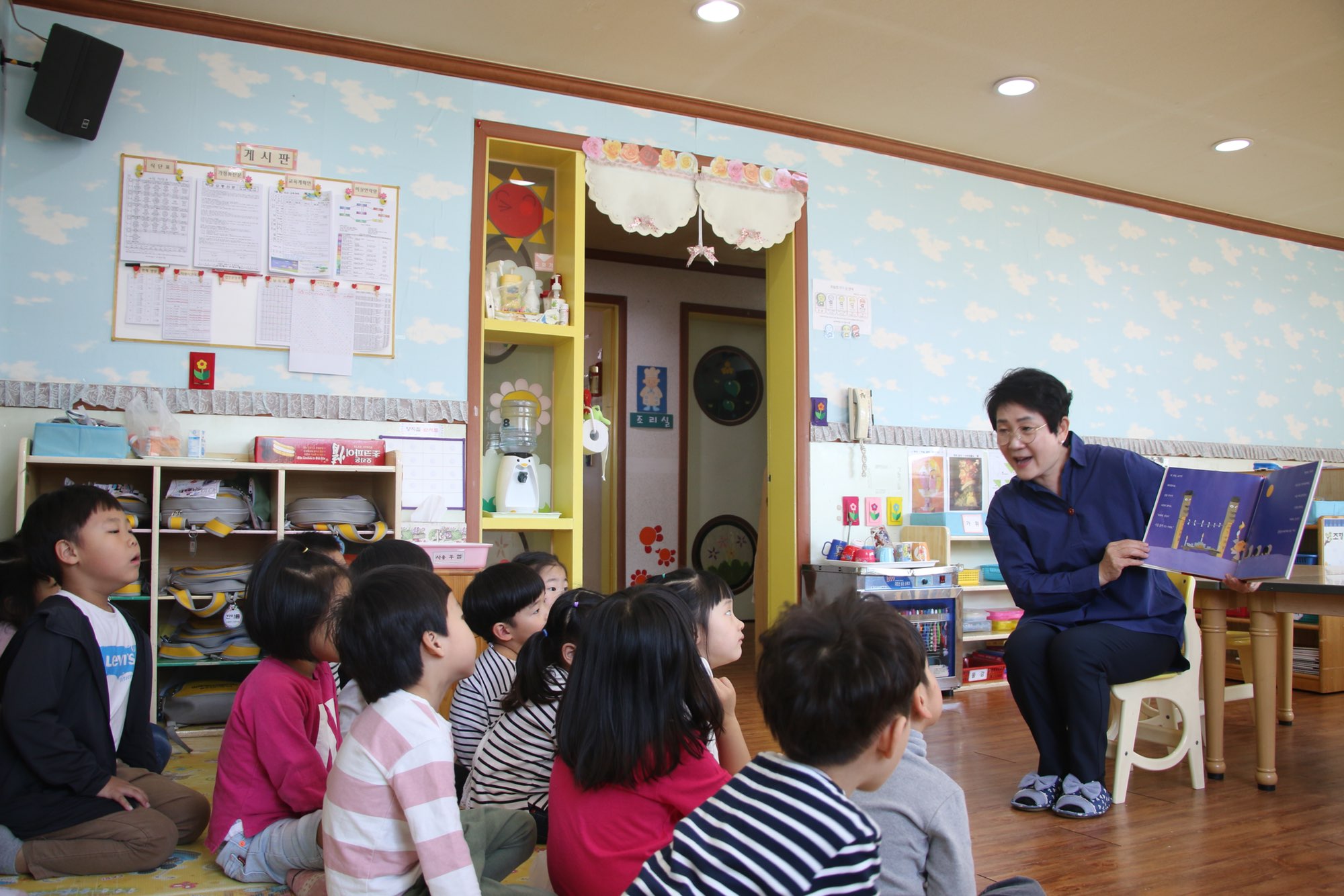 더불어민주당 박정현 대전 대덕구청장 예비후보가 25일 비래동의 한 어린이집을 찾아 아이들에게 동화책을 읽어주고 있다.