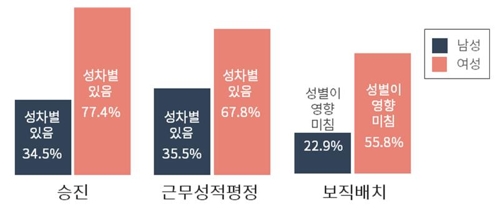 조사 결과에 따르면 승진에서 남성의 64.5%는 '성차별이 없다'고 봤지만, 여성의 77.4%는 '성차별이 있다'고 생각했다.