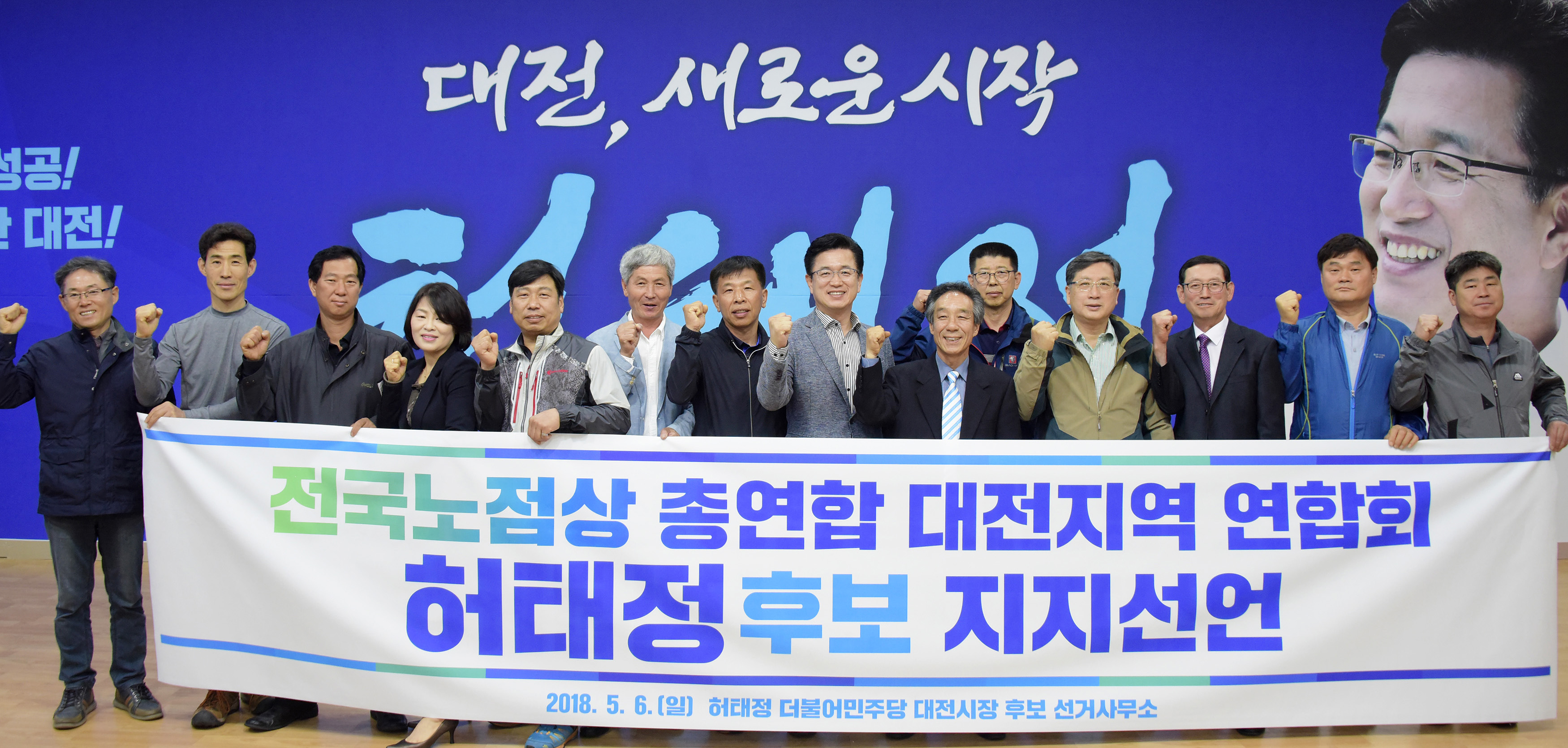 전국노점상총연합 대전지역연합회가 지난 6일 더불어민주당 허태정 대전시장 후보 선거사무소를 찾아 허 후보 지지를 선언한 후 기념촬영을 하고 있다. 허태정 후보 제공 전국노점상총연합 대전지역연합회가 지난 6일 더불어민주당 허태정 대전시장 후보 선거사무소를 찾아 허 후보 지지를 선언한 후 기념촬영을 하고 있다. 허태정 후보 제공