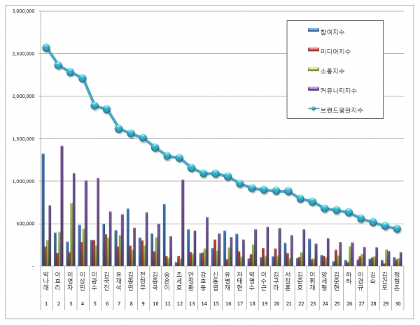 2위, 이효리 브랜드는 참여지수 389,340 미디어지수 153,351 소통지수 401,445 커뮤니티지수 1,412,485가 되면서 브랜드평판지수 2,356,621로 분석되었다. 지난 5월 브랜드평판지수 967,866보다 143.49% 상승했다.