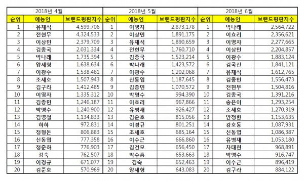 2018년 6월 예능방송인 브랜드평판 30위 순위는 박나래, 이효리, 이영자, 이상민, 이광수, 김국진, 유재석, 김종민, 전현무, 김종국, 송은이, 조세호, 안정환, 강호동, 신동엽, 유병재, 차태현, 박명수, 이수근, 김구라, 서장훈, 김준호, 이휘재, 양세형, 김준현, 하하, 이경규, 김숙, 김건모, 정형돈 순으로 분석되었다.