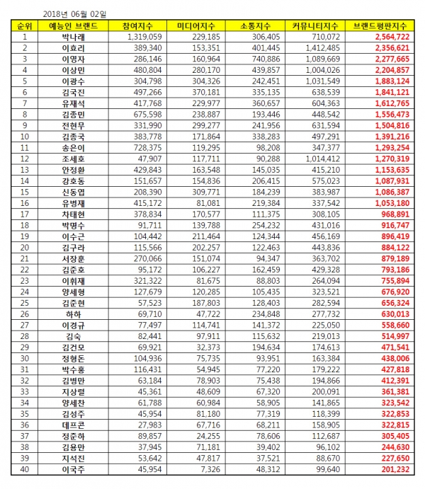 한국기업평판연구소는 2018년 5월 2일부터 2018년 6월 1일까지의 예능인 40명의 브랜드 빅데이터 39,328,712개를 분석하여 소비자들의 예능 방송인 브랜드 참여량, 미디어량과 브랜드에 대한 소통과 확산량을 측정하였다. 5월 예능인 브랜드 빅데이터 32,478,436개와 비교하면 21.09% 증가했다.