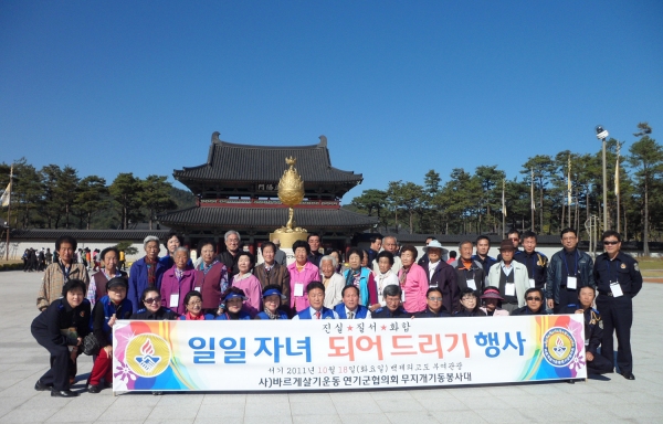 바르게살기운동연기군협의회 산하조직 무지개봉사대(대장 한상옥)가 지난 18일 관내거주 생활이 어려운 어르신 30명을 모시고 ‘일일자녀 되어드리기’ 행사를 통해 부여 일대로 가을 나들이를 다녀왔다.