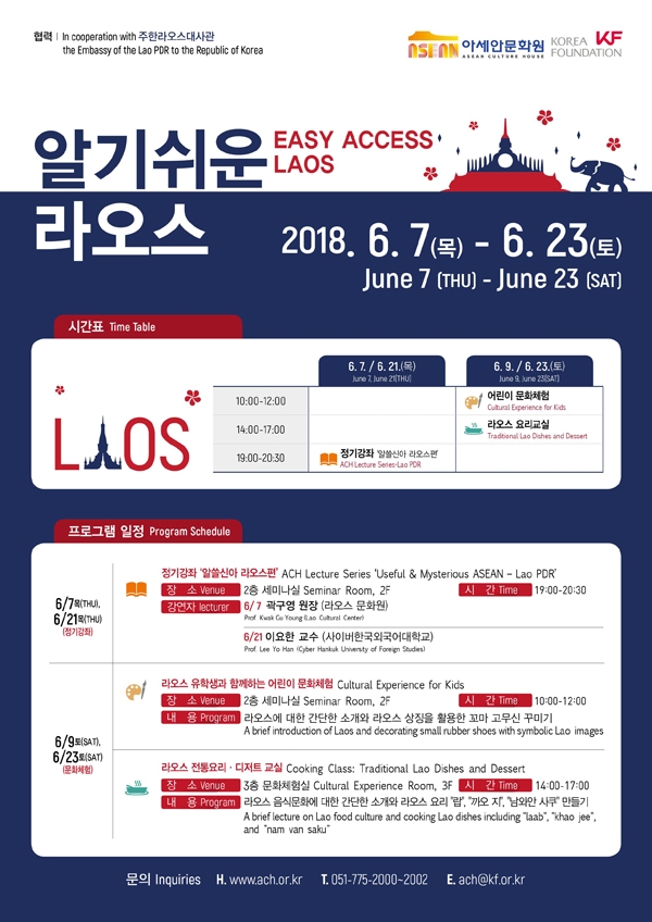 아세안문화원(ASEAN Culture House, ACH)은 오는 6월 7일부터 23일까지 ‘알기쉬운 아세안-라오스편’을 개최한다.