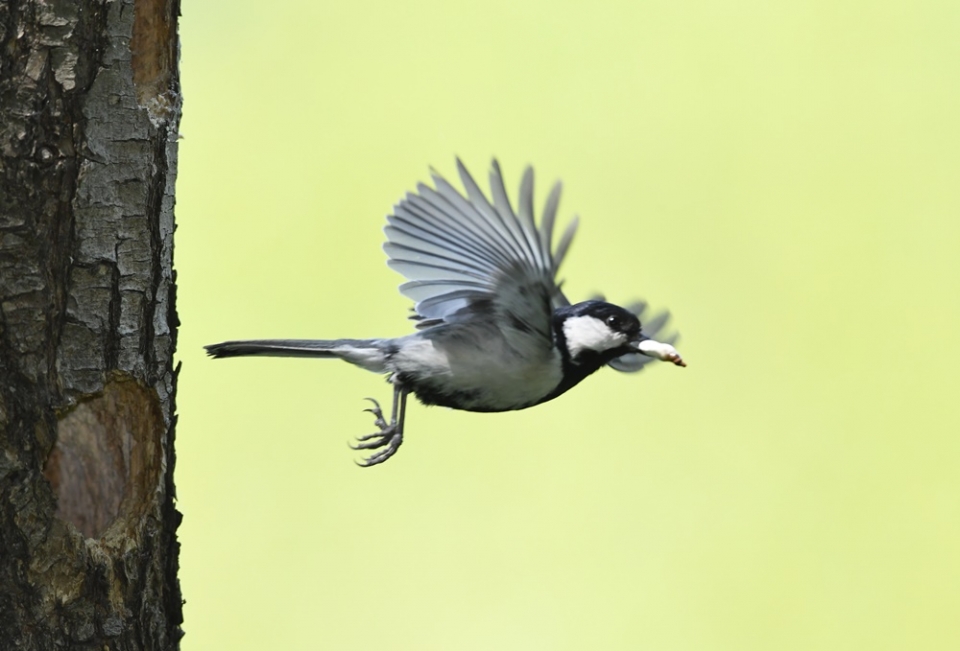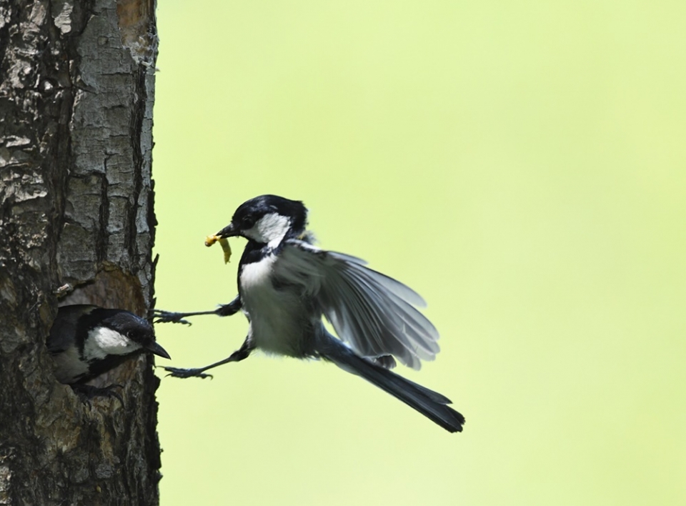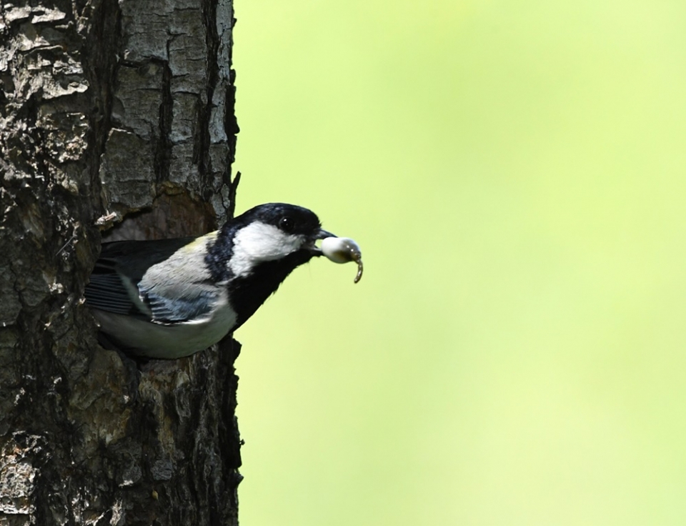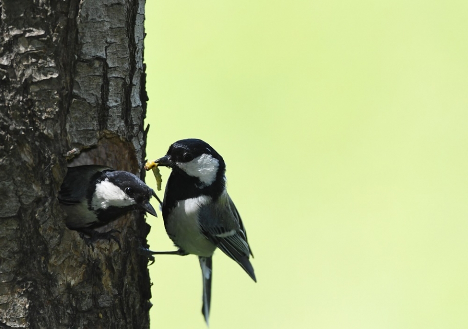 박새는 4∼7월에 주로 나무의 구멍, 처마 밑, 바위 틈, 돌담 틈 등에 둥지를 틀고 한배에 6∼12개의 알을 낳는다. 하루에 수십 차례 먹이를 주는데 새끼들의 배설물을 받아 둥지 밖으로 나가 버리며 교대로 암수가 먹이를 먹인다. 박새는, 한국에서는 숲에 사는 조류의 대표적인 텃새이다. / 배시경 명예기자