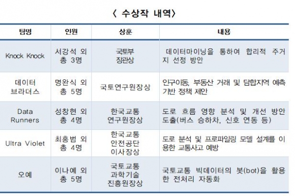 심사 결과, “Knock Knock팀(서강석 외 총 3명)”이 대상으로 선정되어 국토교통부 장관상을 수상했고, 그 외 4개 팀이 우수상을 수상했다.
