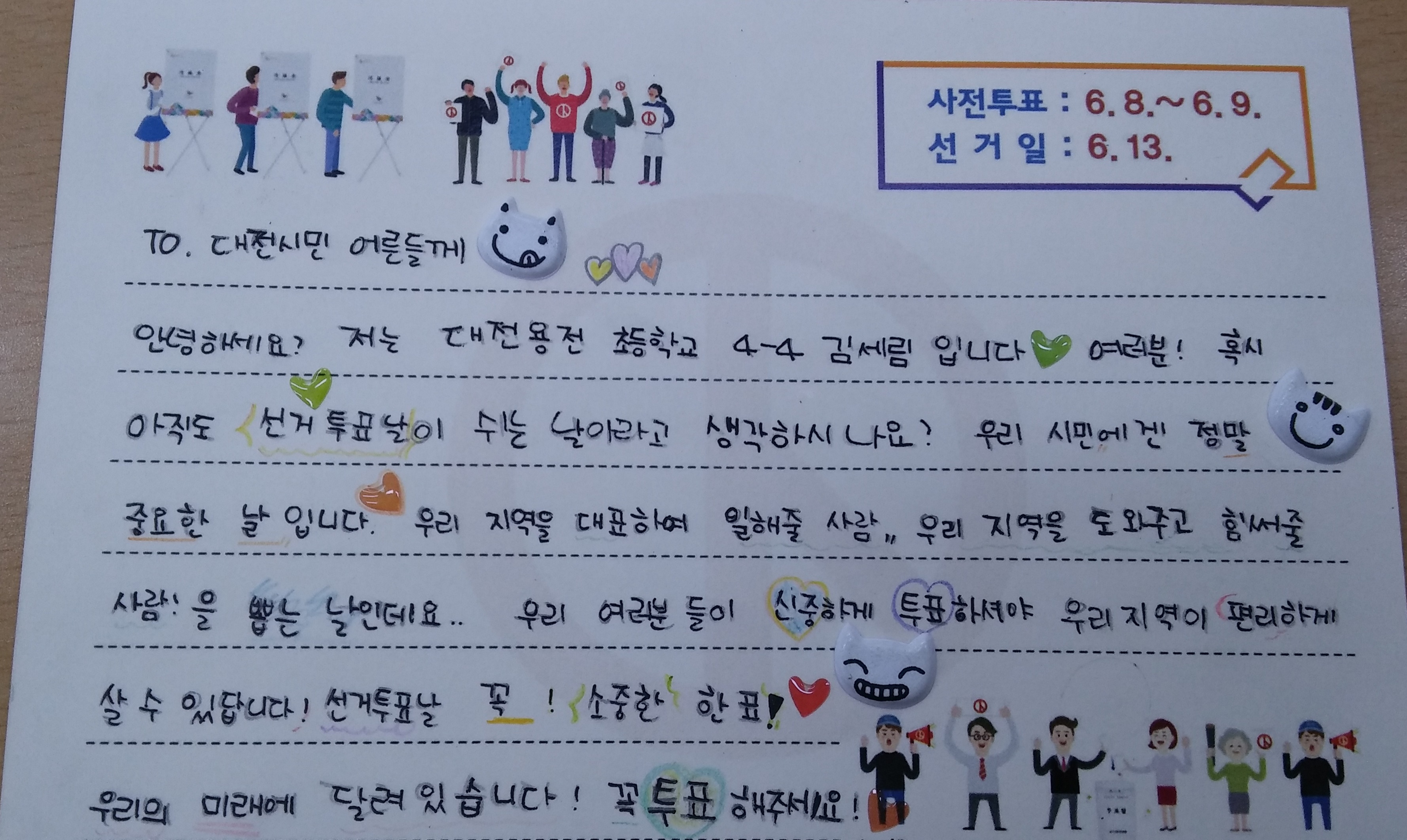 대전동구선관위는 6·13 지방선거 투표율을 높이기 위해 관내 5000여 명의 초등학생을 대상으로 유권자들에게 선거 참여의 중요성에 관한 엽서 쓰기 이벤트를 진행했다. 사진은 ‘소중한 한 표에 우리의 미래가 달려 있다’는 용전초 4학년 김세림 양의 엽서. 대전동구선관위 제공